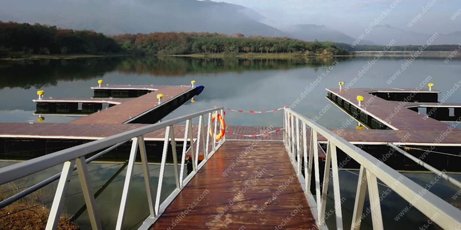 This dock was built in Baisha Lake,Hainan province,it can berth a 40 feet boat,4 pest of jet ski boats and 11 speed boats.The fixing system is steel supporting bar+concrete block.
