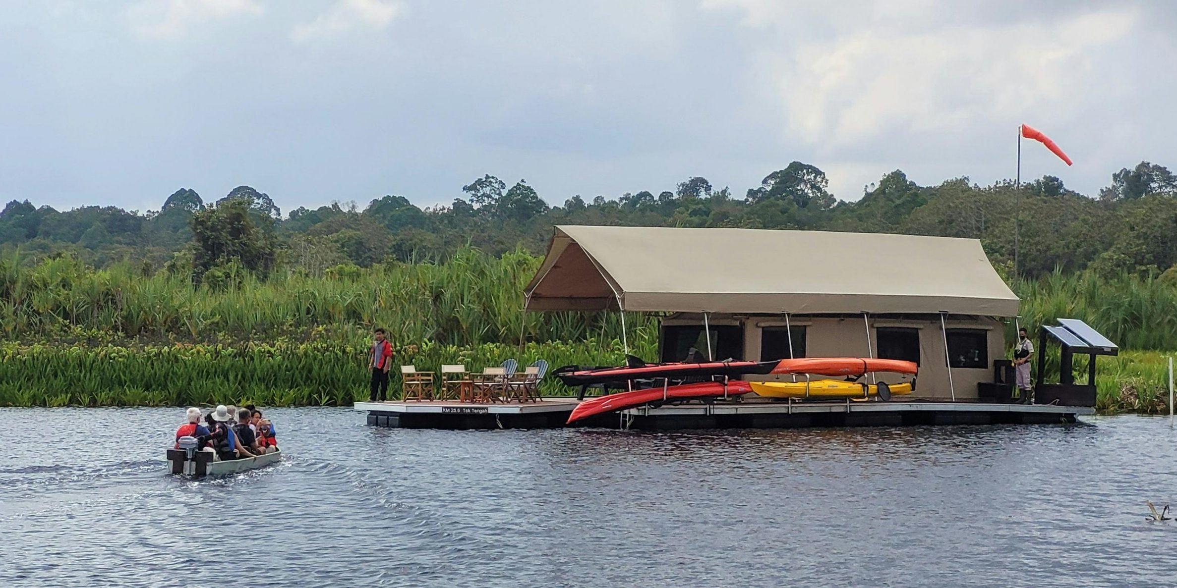 The Tasik Tengah floating helipad and tent camp is used by the Restorasi Ekosistem Riau (RER) program as a Remote Outpost for Forest Security Rangers and RER technical staff to guard and patrol the forest. They also host company guests to visit the site learn more about peat land forest restoration and enjoying kayaking, fishing, and relaxing.